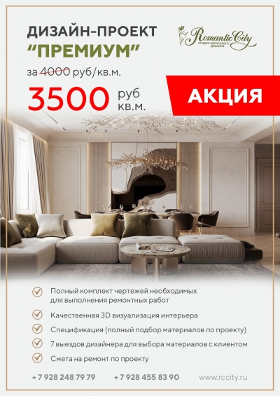 Дизайн-проект с полным подбором материалов и выездами дизайнера по супер выгодной цене! Только в ноябре у Вас есть уникальная возможность заказать проект интерьера по скидке. Мы разработаем для Вас нетолько дизайн интерьера, но и подберем все материалы, мебель, технику с учетом вашего бюджета. Вам не придется искать магазины, узнавать стоимость. Все это сделаем мы! Также в данный пакет входят выезды с дизайнером по магазинам! Ждем Вас друзья!